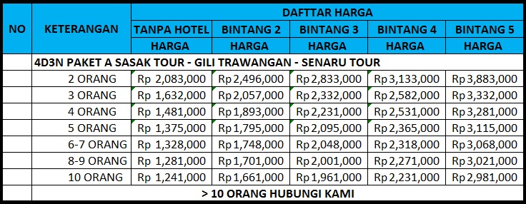 - HargaHanya Berlaku hanya untuk WNI/KITAS. Untuk WNA Biaya Tambahan 20%.